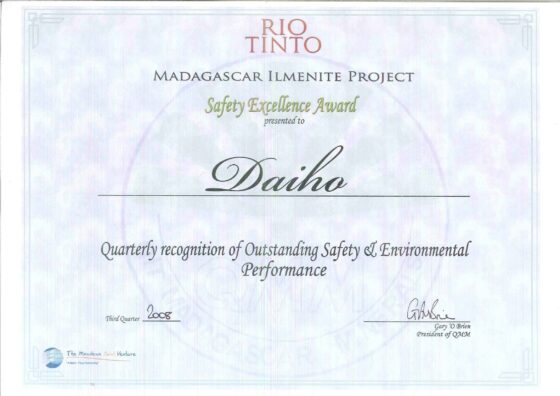 RIO TINTO, Employer of Ehoala Port Project granted us the Safety Excellence Awards Certificate and Trophy to commmorate quarterly recognition of outstnding safety & environmental performance.