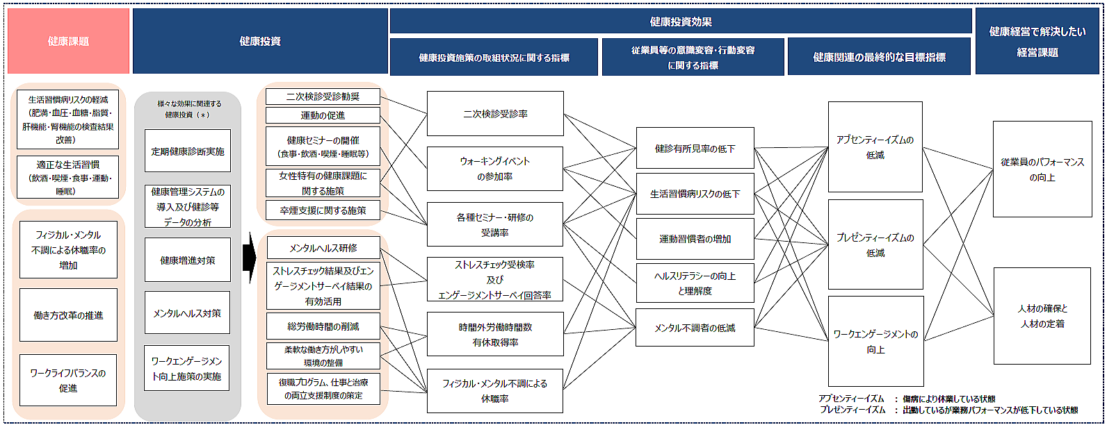 健康経営の推進方針、目標、健康経営施策等のつながりを可視化するため、戦略マップを作成しています。
